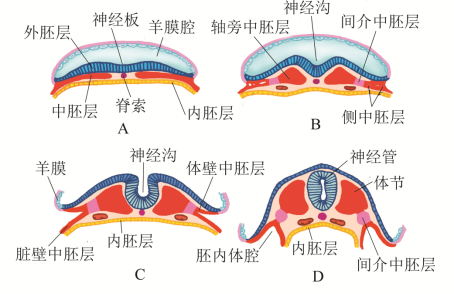 1.外胚层的分化:神经外胚层分化成神经系统,表面外胚层分化成表皮及附属器。在脊索的诱导下,其背侧中线外胚层细胞增生→神经板→神经褶、神经沟→神经管(前神经孔,后神经孔)