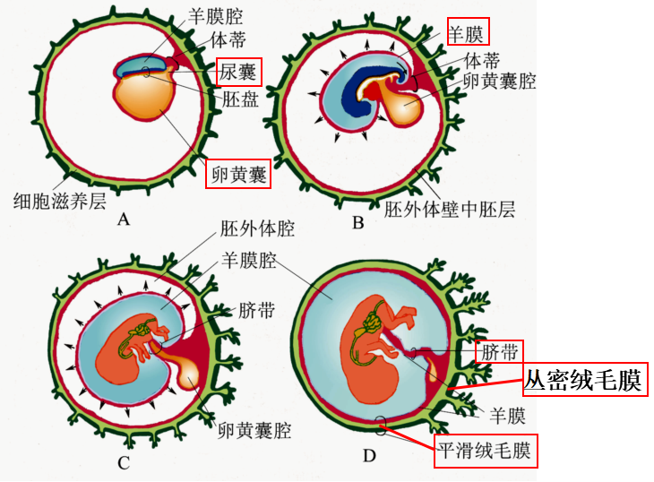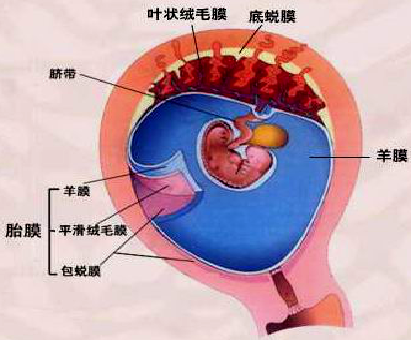 胎膜(fetal menbrane)包括绒毛膜、羊膜、卵黄囊、尿囊和脐带