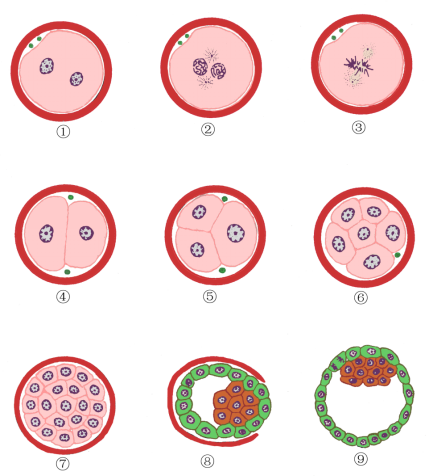 ④2细胞期;⑤4细胞期;⑥8细胞期;⑦桑葚胚;⑧早期胚泡;⑨胚泡