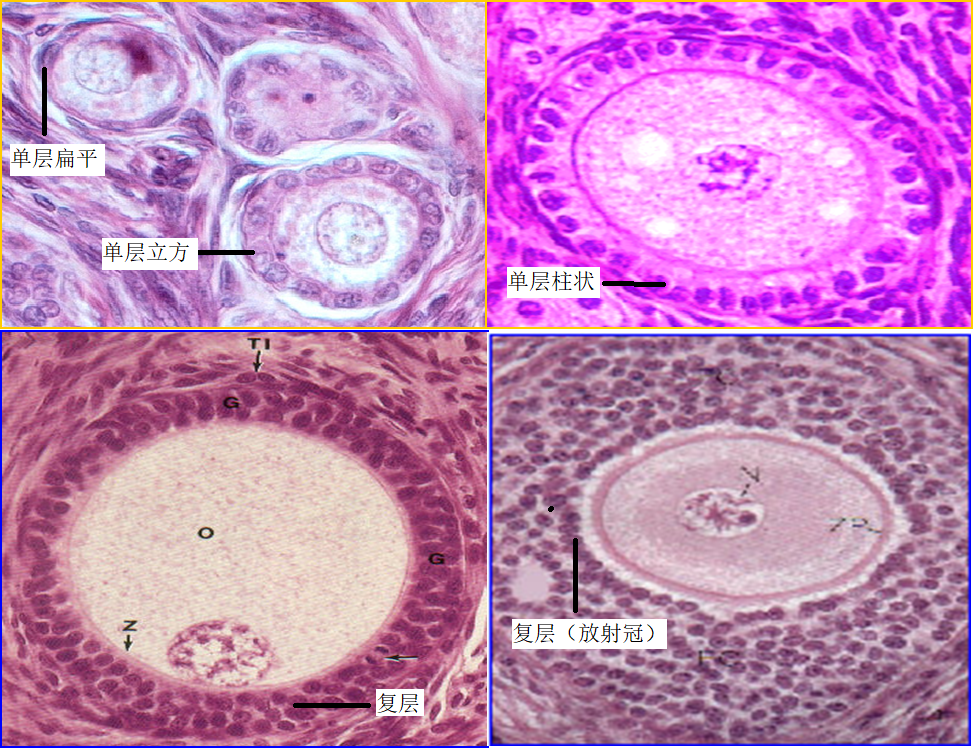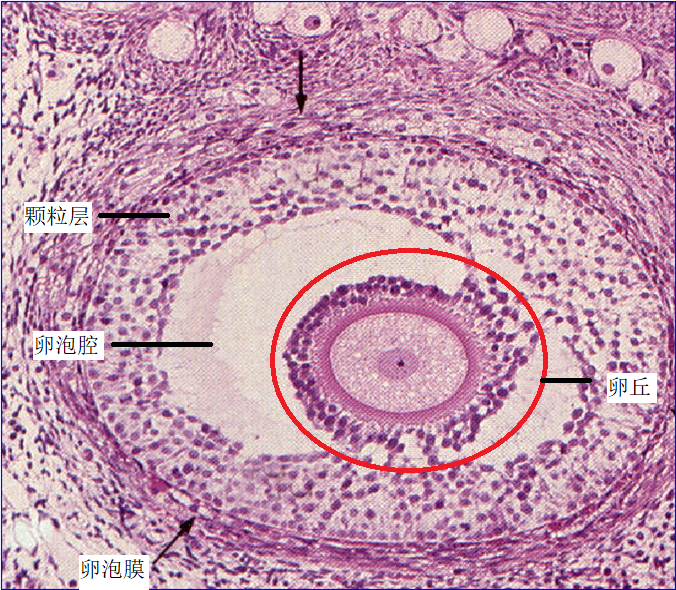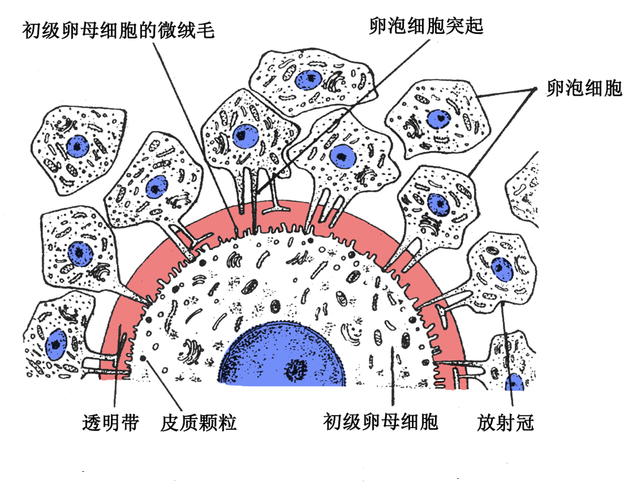 从青春期开始,在腺垂体分泌的卵泡刺激素(FSH)的作用下,卵泡生长发育,生长卵泡(growing follicle)的结构和大小差别较大,可以分为初级卵泡和次级卵泡(secondaryfollicle)两个阶段。