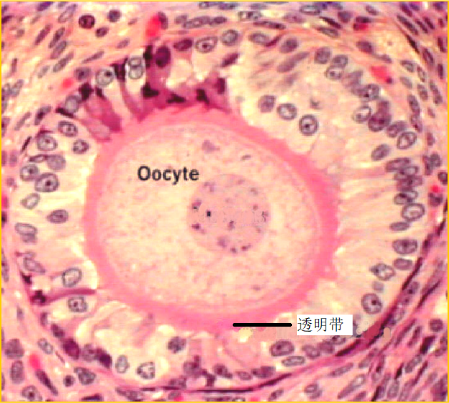 在初级卵母细胞与放射冠的卵泡细胞之间出现一层富含糖蛋白的均质状、折光性强的嗜酸性膜称为透明带(zona pellucida)(图19-8),内含的透明带蛋白(zona protein,ZP)分为ZP1、ZP2和ZP3三种,是由初级卵母细胞和卵泡细胞共同分泌形成,其中ZP3为精子受体,在受精过程中对卵细胞与精子的相互识别和特异性结合具有重要意义。电镜下,可见初级卵母细胞的微绒毛和卵泡细胞的突起伸进透明带,并形成许多缝隙连接,有利于将营养物质输送给卵母细胞,以及细胞间离子、激素和小分子物质的交换,从而沟通信息、协调功能。受精过程中,透明带对精子与卵子细胞相互识别和特异性结合具有重要作用(图19-9)。