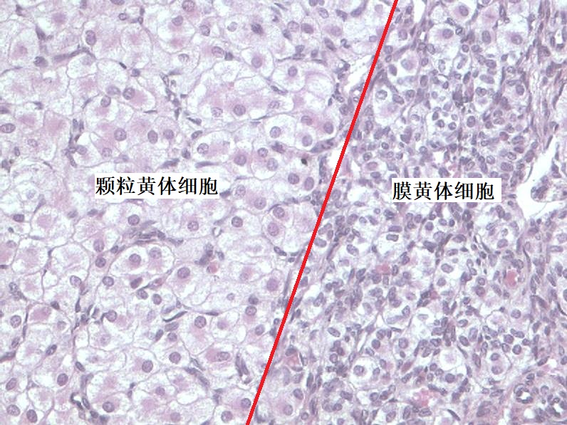随着卵泡的生长,卵泡壁周围的基质细胞向卵泡聚集,形成卵泡膜(theca folliculi)。卵泡膜分为两层。内层血管丰富,基质细胞分化成多边形或梭形的膜细胞(theca cell),具有类固醇分泌细胞的特征。外层有环行排列的胶原纤维和平滑肌纤维。膜细胞能合成雄激素,雄激素透过基膜,在颗粒细胞内转化为雌激素,故雌激素是由两种细胞合成的。少量的雌激素进入卵泡液,大部分进入血液循环,作用于子宫等靶器官。