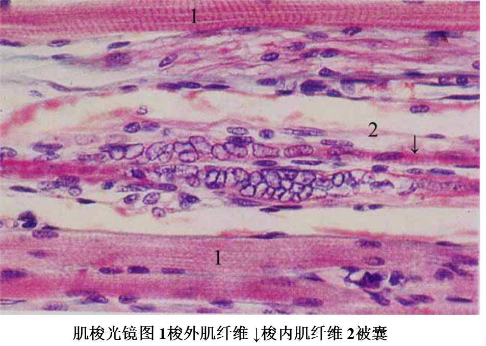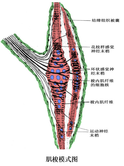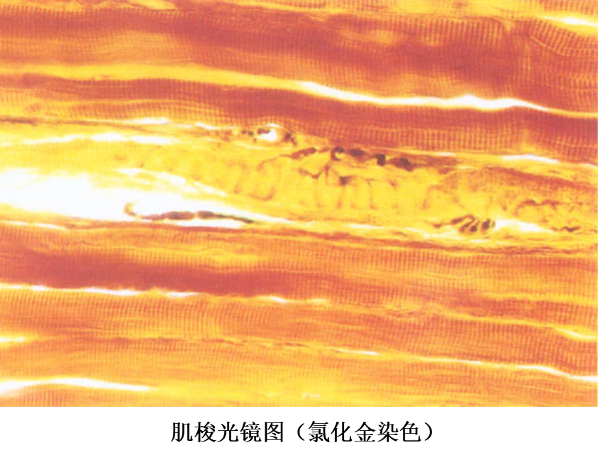 (3)肌梭(muscle spindle):是分布在骨骼肌内的梭形小体,长约1~7mm,外有结缔组织被囊,内含若干条细小的骨骼肌纤维称梭内纤维(intrafusal muscle fiber)。梭内肌纤维的中段肌浆较多,肌原纤维较少,有些肌纤维的细胞核排列成串,有些肌纤维的细胞核聚集在中段而使中段膨大。感觉神经纤维进入肌梭时失去髓鞘,其轴突细支呈环状包绕梭内肌纤维的两端。肌梭是一种本体感受器,主要感受肌纤维的伸缩变化,在调节骨骼肌的活动中起重要作用。