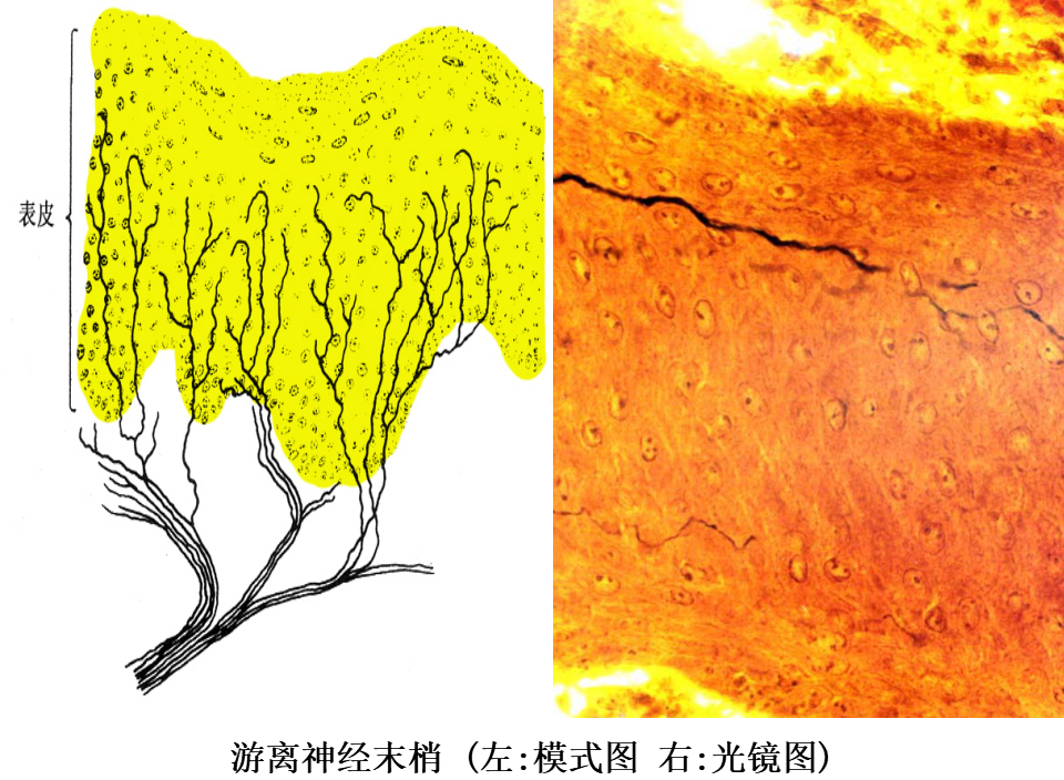 1.游离神经末梢 游离神经末梢(free nerve ending)结构较简单。较细的有髓或无髓神经纤维的终末部分失去施万细胞,裸露的轴突末段分成细支,分布在表皮、角膜和毛囊的上皮细胞间,或分布在各型结缔组织内,如骨膜、脑膜、血管外膜、关节囊、肌腱、韧带、筋膜和牙髓等处。此类末梢感受冷、热、轻触和痛的刺激。