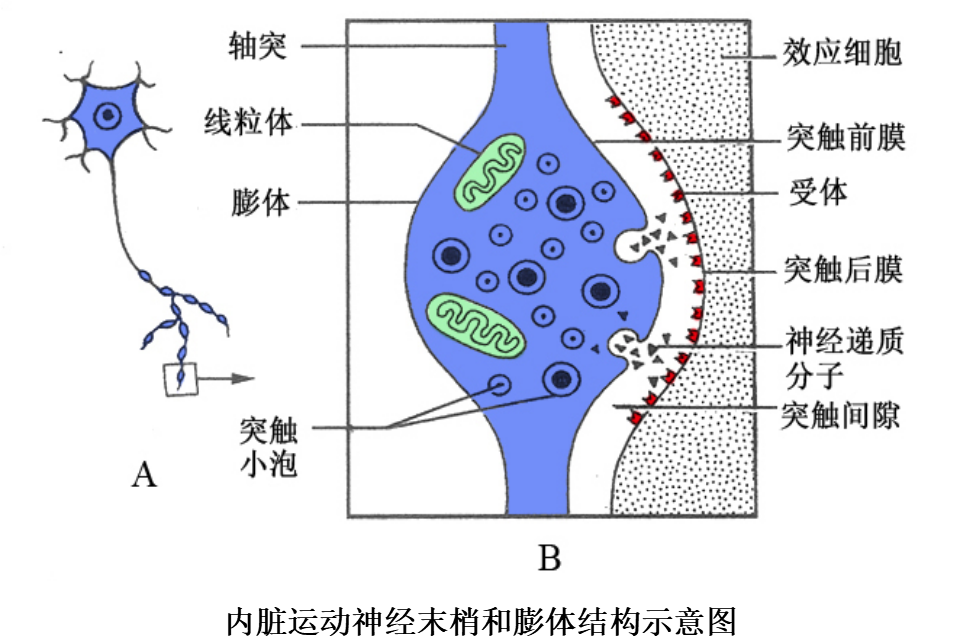 2.内脏运动神经末梢(visceral motor nerve ending) 分布于内脏及血管平滑肌、心肌和腺细胞等处。这类神经纤维较细,无髓鞘,其轴突终末分支常呈串珠样膨体(varicosity),黏附于肌细胞表面或穿行于腺细胞之间,与效应细胞建立突触。膨体内有许多圆形或颗粒型突触小泡,圆形清亮突触小泡含乙酰胆碱,颗粒型突触小泡含去甲肾上腺素或肽类神经递质。