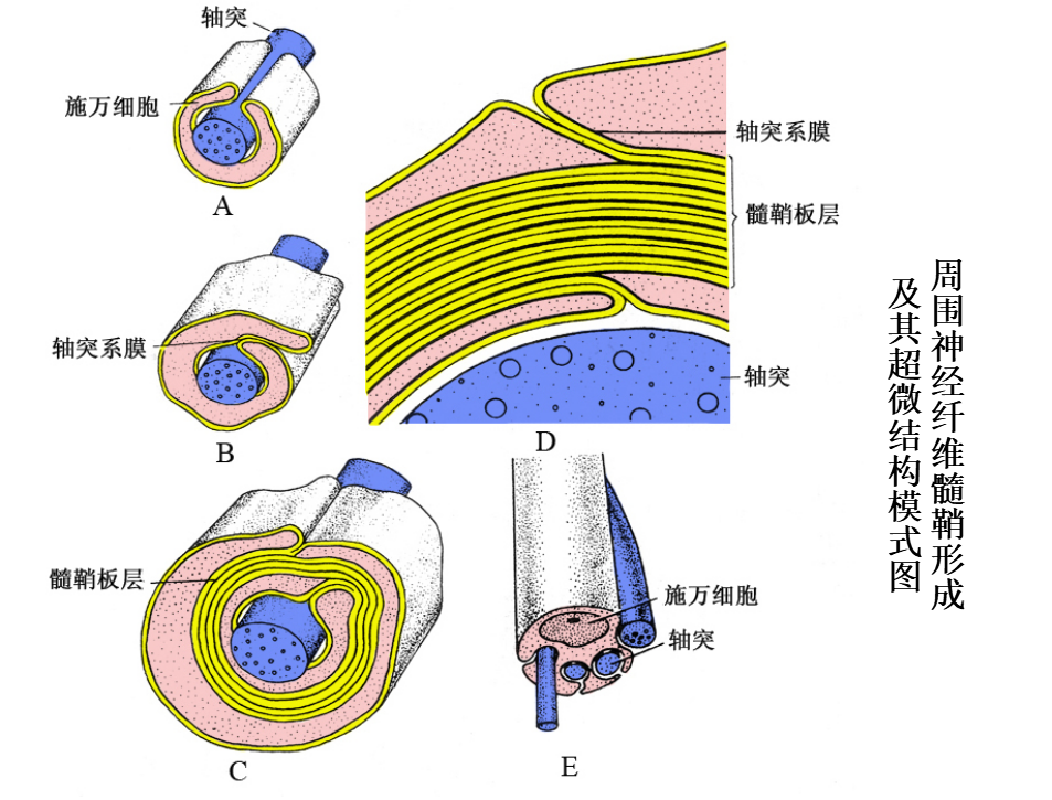 髓鞘的形成:在有髓神经纤维发生中,伴随轴突一起生长的施万细胞表面凹陷成一纵沟,轴突位于纵沟内,沟缘的胞膜相贴形成轴突系膜(mesaxon)。轴突系膜不断伸长并反复包卷轴突,把胞质挤至细胞的内、外边缘及两端(即靠近郎氏结处),从而形成许多同心圆的螺旋膜板层,即为髓鞘。故髓鞘乃成自施万细胞的胞膜,属施万细胞的一部分。施万细胞的胞质除见于细胞的外、内边缘和两端外,还见于髓鞘板层内的施-兰切迹。该切迹构成螺旋形的胞质通道,并与细胞外、内边缘的胞质相通。