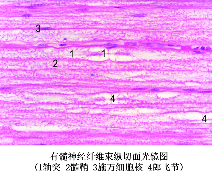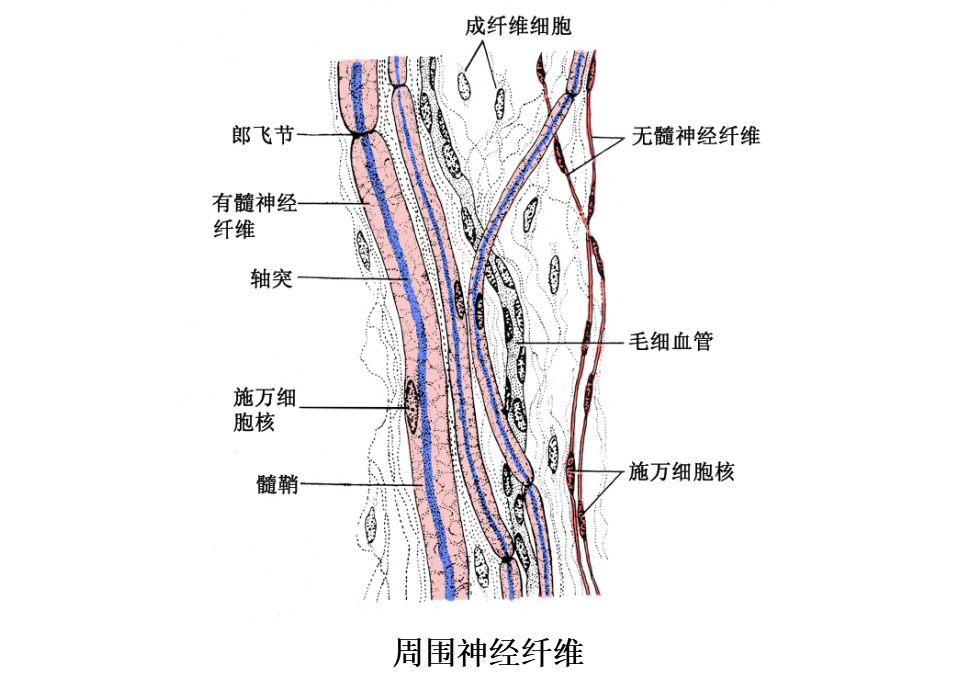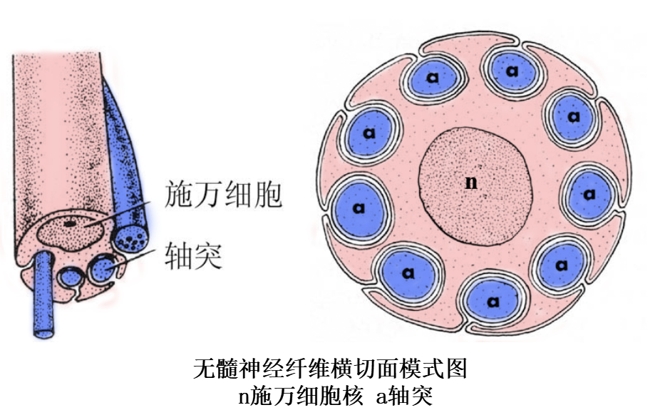 (1)周围神经系统的无髓神经纤维:由较细的轴突和包在它外面的施万细胞组成。施万细胞沿着轴突一个接一个地连接成连续的鞘,但不形成髓鞘,故无郎氏结;而且一个施万细胞可包裹许多条轴突。施万细胞外面亦有基膜。