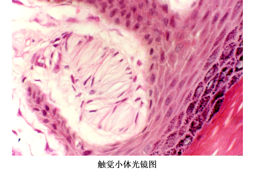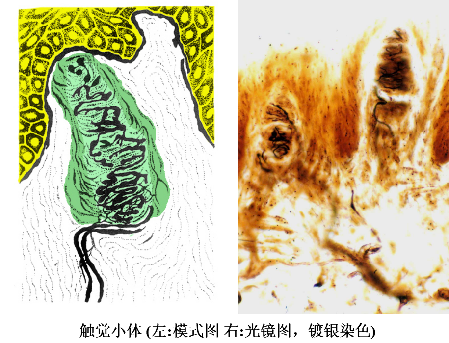 (1)触觉小体(tactile corpuscle)又称Meissner小体,分布在皮肤真皮乳头内,以手指、足趾的掌侧皮肤居多,感受触觉,其数量可随年龄增长而减少。触觉小体呈卵圆形,长轴与皮肤表面垂直,外包有结缔组织囊,小体内有许多横列的扁平细胞。有髓神经纤维进入小体时失去髓鞘,轴突分成细支盘绕在扁平细胞间。