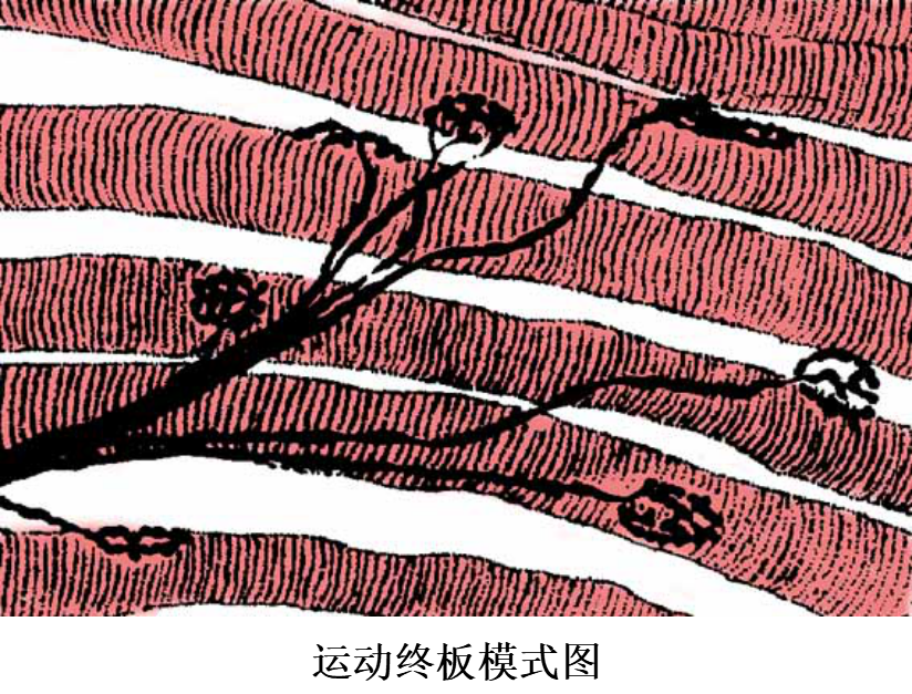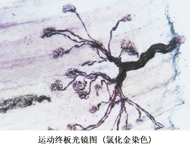 1.躯体运神经末梢(somatic motor nerve ending) 分布于骨骼肌内。神经元的胞体位于脊髓灰质前角或脑干,轴突很长,离开中枢神经系统后成为躯体传出(运动)神经纤维,其中小部分细有髓神经纤维供应肌梭内的梭内肌纤维,其余大部分粗有髓神经纤维均分布于骨骼肌(梭外肌)。有髓神经纤维抵达骨骼肌时失去髓鞘,其轴突反复分支,每一分支形成葡萄状终末与一条骨骼肌纤维建立突触连接,此连接区域呈椭圆形板状隆起,称运动终板(motor end plate)或神经肌连接(neuromuscular junction)。