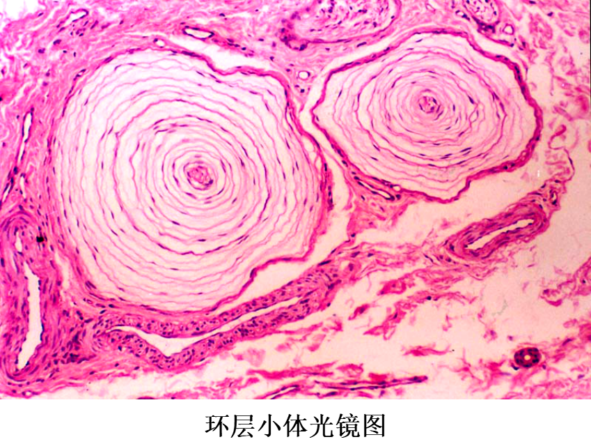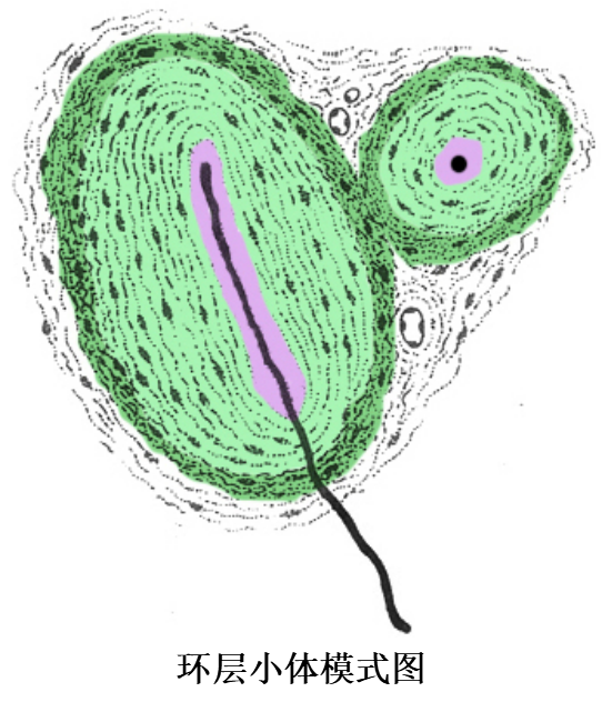 (2)环层小体(lamellar corpuscle):又称Pacinian小体,体积较大(直径1~4mm),卵圆形或球形,广泛分布在皮下组织、肠系膜、韧带和关节囊等处,感受压觉和振动觉。小体的被囊是由数十层呈同心圆排列的扁平细胞组成,小体中央有一条均质状的圆柱状。有髓神经纤维进入小体失去髓鞘,裸露轴突穿行于小体中央的圆柱体内。