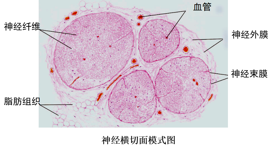 包裹在神经外面的致密结缔组织称神经外膜(epineurium)。神经内的神经纤维,又被结缔组织分隔成大小不等的神经纤维束,包裹每束神经纤维的结缔组织称神经束膜(perineurium)。神经束膜的外层是结缔组织,内层则由多层的扁平上皮细胞组成,称神经束膜上皮(perineural epithelium),上皮细胞之间有紧密连接,每层上皮都有基障进入神经内部。神经纤维束内的每条神经纤维又有薄层疏松结缔组织包裹,称神经内膜(endoneurium)。神经内的血管较丰富,神经外膜内的纵行血管发出分支进入神经束膜,进而在神经内膜形成毛细血管网。神经内膜亦含有淋巴管。