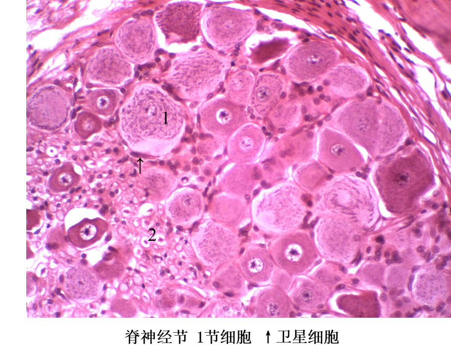 2.卫星细胞 卫星细胞(satellite cell)是神经节内包裹神经元胞体的一层扁平或立方形细胞,故又称被囊细胞。细胞核圆或卵圆形,染色较深。细胞外面有一层基膜。