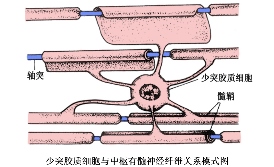 其结构基本与周围神经系统的有髓神经纤维相同,不同的是它的髓鞘不是施万细胞,而是由少突胶质细胞突起末端的扁平薄膜包卷轴突而形成。一个少突胶质细胞有多个突起可分别包卷多个轴突,其胞体位于神经纤维之间。其次是中枢有髓神经的外表面没有基膜包裹,髓鞘内亦无施-兰切迹。