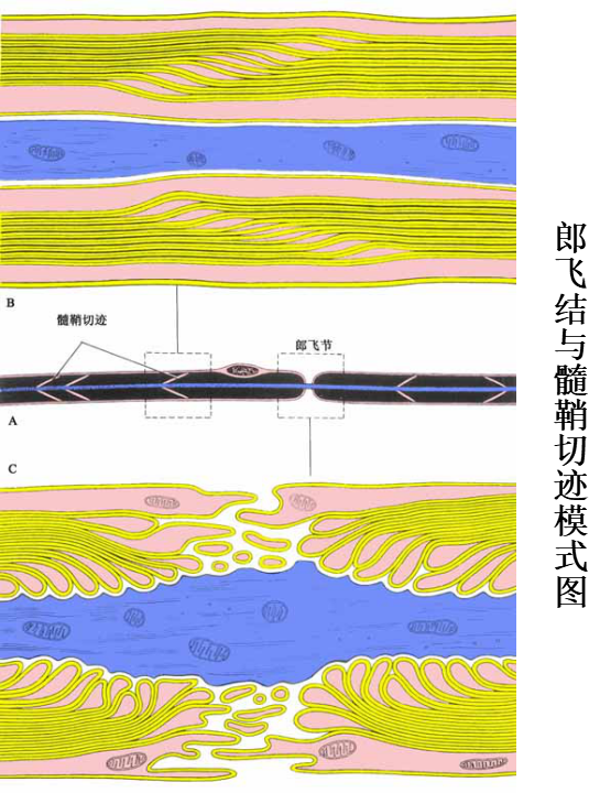 神经纤维的轴突,除起始段和终末外均包有髓鞘。髓鞘分成许多节段,各节段间的缩窄部称郎氏结(Ranvier node)。轴突的侧支均自郎氏结处发出。相邻两个郎氏结之间的一段称结间体(internode)。轴突越粗,其髓鞘也越厚,结间体也越长。每一结间体的髓鞘是由一个施万细胞的胞膜融合,并呈同心圆状包卷轴突而形成的,电镜下呈明暗相间的同心状板层。髓鞘的化学成分主要是类脂和蛋白质,称髓磷脂(myelin)。髓磷脂中类脂含量很高,约占80%,故新鲜髓鞘呈闪亮的白色,但在常规染色标本上,因类脂被溶解,仅见残留的网状蛋白质。若标本用锇酸固定和染色,髓磷脂保存,髓鞘呈黑色,在其纵切面上常见一些漏斗型的斜裂,称施-兰切迹(Schmidt-Lantermann incisure)。