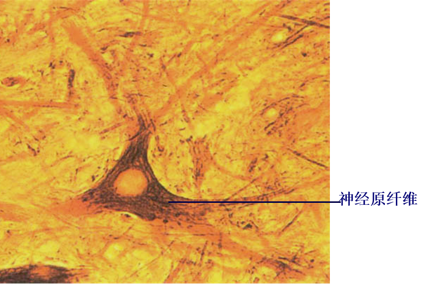 神经原纤维(neurofibril):在HE染色切片无法分辨。在镀银染色切片中, 呈棕黑色细丝,交错排列成网,并伸入树突和轴突。电镜下由神经丝、微管和微丝构成。神经丝是由神经丝蛋白构成的一种中间丝,它们除了构成神经元的细胞骨架外,微管还参与物质运输。