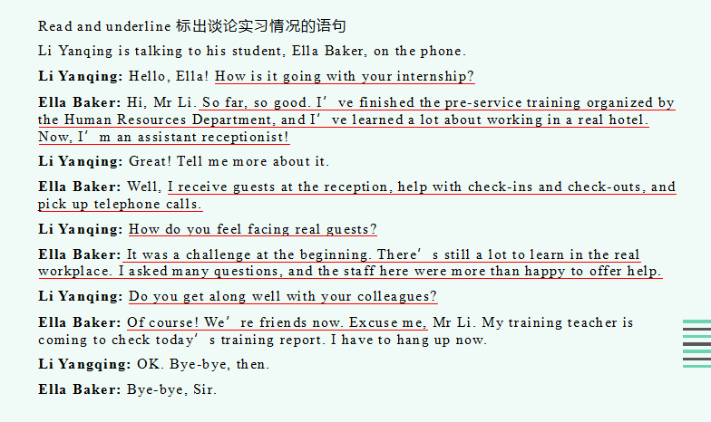 Ella Baker: Hi, Mr Li. So far, so good. I’ve finished the pre-service training organized by the Human Resources Department, and I’ve learned a lot about working in a real hotel. Now, I’m an assistant receptionist!