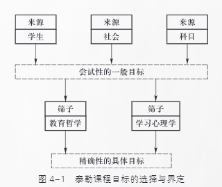 在课程开发的过程中,课程目标的选择和界定是首先必须要解决的重要问题:泰勒通过总结和概括各种观点,提出了简洁明了地确定目标的技术理论,有学者将其形象地概括为“三个来源”和“两把筛子”。其中,“三个来源”是指教育目标应该来源于三个方面,即对学习者本身的研究、对校外当代生活的研究和学科专家对目标的建议;“两把筛子”指的是“教育哲学”和“学习心理学”。“教育哲学”和“学习心理学”的基本原则为最终确立教育目标提供了重要的判断依据。这样,课程目标的选择过程就可以用一个简图加以表示(见图4-1 )。