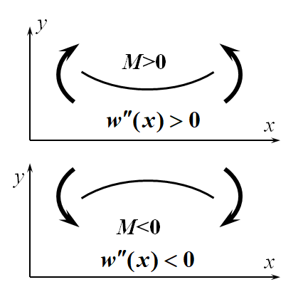在图示坐标系内,若弯矩M为正,则挠曲线向下凸,有极小值,挠度的二阶导数亦为正值。若弯矩M为负,则挠曲线向上凸,有极大值,挠度的二阶导数亦为负值。