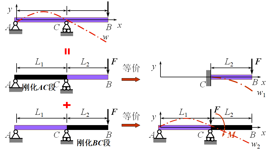 为求图示外伸梁B截面的挠度,将梁的BC段视为C端为固定端的悬臂梁,此梁在F作用下B截面的挠度为w1。外伸梁的C截面并非固定不动,而要产生转角,截面的转动对BC段位移的影响,相当于使BC段绕C点刚性转动,此时B截面的竖向位移为w2。将w1与w2叠加就是外伸梁B截面的挠度,即