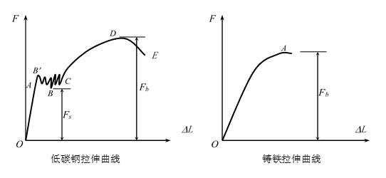 试验时,利用试验机的测量系统可绘出低碳钢拉伸曲线和铸铁拉伸曲线。对于低碳钢,拉伸曲线在屈服阶段常呈水平锯齿状,上屈服点影响因素较多而不稳定,一般常用较稳定的下屈服点B对应的载荷作屈服载荷Fs。到达屈服点以后,变形较明显。试件在到达最大载荷Fb以前,变形是均匀的。从最大载荷D点处开始,在试件局部区段,迅速伸长,并出现颈缩。之后,由于局部部位直径减少,拉伸所需载荷也相应减小,直到E点断裂,最大载荷可从拉伸曲线上读到。断面呈凹凸状。