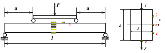 选取一具有纵向对称面的矩形截面简支梁,在距两端等距的两个截面上施加大小相等的作用力F/2,使梁中部承受纯弯曲,在纯弯段内沿梁高等距分布粘贴五枚应变片,使应变片轴线与梁轴线平行,在梁上表面贴一枚与轴线垂直的应变片以测定横向应变。