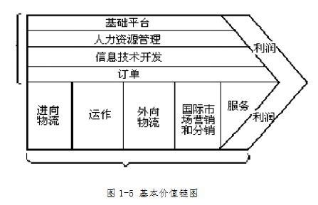 以上的价值链概念描述是十分重要的对于理解供应链管理有很大意义。把价值链中的相互独立的部分结合在一起的手段就是所谓的链接。当价值链中的一个元素影响另二个元素的成本或有效性时,就会发生这样的链接。于是,装备计算机系统就可能降低行政管理的成本;而电子采购可以降低获取资源的成木。链接需要协调。为了确保按时送货到位,需要(生产)运作、外向物流和服务的业务活动之间的协调。价值链的差异化。这是因为在一个个别的企业中业务活动是受许多变量影响的,这些变量包括工作方式、企业资源规模和融资来源、革新创新能力、劳动力技能以及内部集成化程度。自行生产所有零配件的制造商的内部成本,通常比靠对外采购零配件而只做组装部件的竞争对手的内部成本要高。价值系统反映了一个企业的价值链,既有内部链接,也有外部链接。企业通过管理它自己与供应商和客户的链接来获得竞争优势。这种链接的一个例子就是及时系统(JIT),它的基本点就是将采购方的运作与供应方的运作紧密地集成在一起。图1-6展示了这一价值系统。
