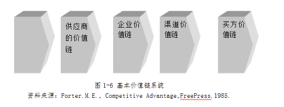 1985年,哈佛商学院的迈克尔·波特(Michael Porter)教授在其《竞争优势》一书中首次提出“价值链”这一概念,并对其进行了比较详细的阐述。波特理论的核心是边际收益(margin)的概念,边际收益是指客户所感知的企业产品和服务的价值减掉成本后的值。Porter的价值链通常被认为是传统意义上的价值链,较偏重于以单个企业的观点来分析企业的价值活动、企业与供应商和顾客可能的连接,以及企业从中获得的竞争优势。