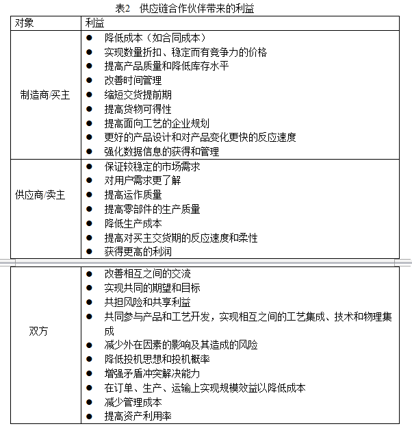 通过供应链合作伙伴关系,能过给制造商/买主、供应商/卖主及双方等都带来利益。如下表所示: