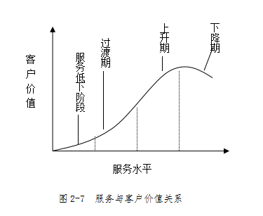 2.服务。客户服务包括可得性,对客户的承诺等,从无到有,从低水平到高水平,对客户价值的影响可以分为几个阶段:如图