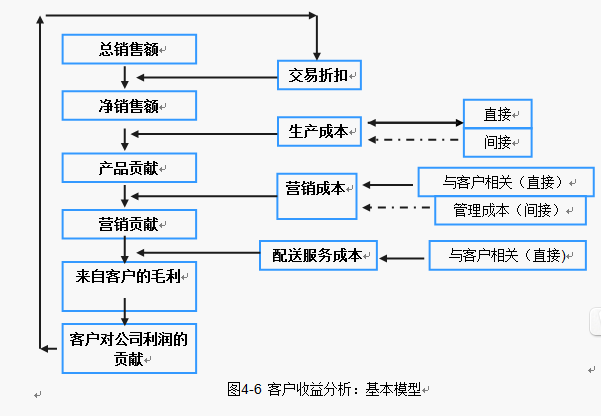 该模型以订单销售总额为起点,减去给予客户的折扣,得出净销售额,这其中包含了直接生产成本和销售成本。除非间接成本均由客户产生,否则不能将全部的间接成本分摊给客户。同样的道理适用于销售和市场成本中间接成本的分摊。例如,全国广告的费用若要硬性分摊,则有强迫和误导之嫌。随后,分派配送可归属成本以得到来自客户的毛利。最后,减去所有其他与相关的成本,如贸易信贷、退货成本等,从而得出营运成本的净利。