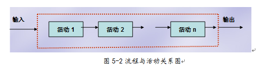 从图5-1,5-2可看出,组成流程的各种活动的类型差异与相互之间的复杂关系,决定了流程的性质。通过对不同活动、活动所组成的不同性质的流程、活动与活动之间的关系、流程与流程之间的关系,以及活动或流程的承担者顺序的描述,便可得出各种各样的流程图,它们生动地描述了企业组织的业务流程。