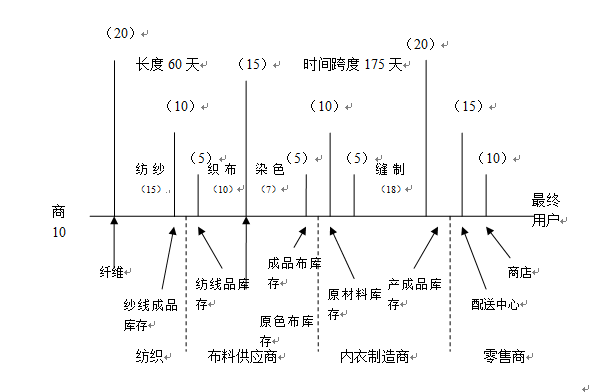 “水平”和“垂直”标识是指图5-8中的两个轴,它们各自代表过程时间和静止存货时间。下图描述了男性内衣的制造和配送过程。从图可以看出水平时间是60天,换句话说,采集原料、纺纱、织布、染色、整理、缝纫等花费了60天才完成了从开始到结束的过程。水平时间是很重要的,因为它决定着系统对增长的需求做出反应所需花费的时间。因此,如果存在可持续增长的需求,将花费很长的时间才能把产量逐渐提高到新的水平。相反地,如果需求存在下降的趋势,那么时间跨度,也就是水平时间和垂直时间之和就成了关键点。换句话说,需要175天才能消化掉全部存货。正如例中所显示的,在变幻莫测的时装市场上,供应链的时间跨度是决定业务风险的一个重要因素。