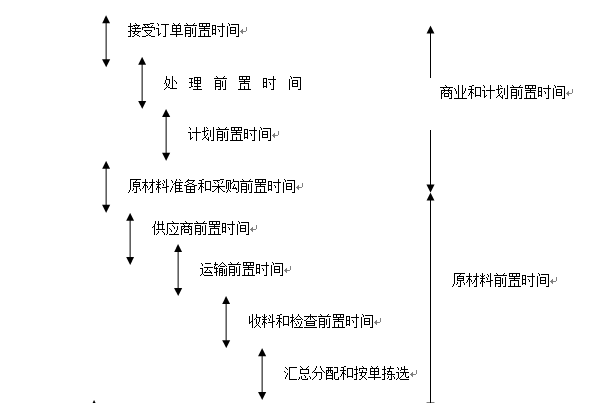 前置时间是订单分配与货品运送的周期时间,通常以天数或小时计算。从客户的角度来说,前置时间就是从发出订单到收到货物的这段时间。不难看出,随着市场对时间越来越敏感,前置时间已经成为企业竞争的一个重要环节。然而这只描述了前置时间的一个侧面。另一方面是从供应商的角度来看,前置时间是指从接受订单到收回现金的时间,也就是指从最开始用生产资金购买原材料到最后收到客户支付货款的总时间。前置时间的减少会使生产商和零售商平均库存水平得到减少,而且前置时间的减少可以使零售商订货模型更加稳定,也会给生产商的生产决策来带很大好处,能保证生产商和零售商的双赢。
