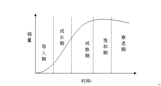 产品生命周期就是从产品投入市场到最后淡出市场的时间,一般来说,产品都会经历导入期、成长期、成熟期、饱和期到最后的衰退期。如图所示: