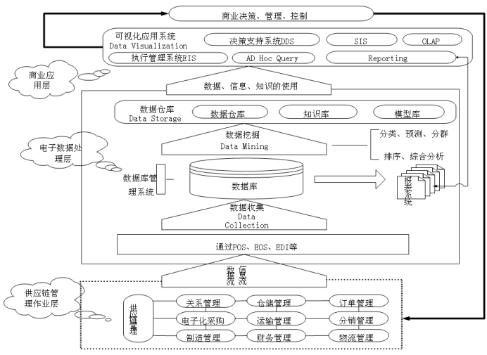 这个层次是将“供应链管理操作层”中实质性操作过程的数据和信息,通过各种收集数据的子系统,如EOS、POS、EDI等等,收集到数据库中来。通过数据库管理系统管理收集和存储这些数据。一些数据通过分类、排序、综合分析的数据挖掘过程,形成特有的商业信息、商业知识、商业模型等。这些结构化的信息、知识和模型可供“商业应用层”调用,在企业的决策、管理、控制过程中发挥作用。