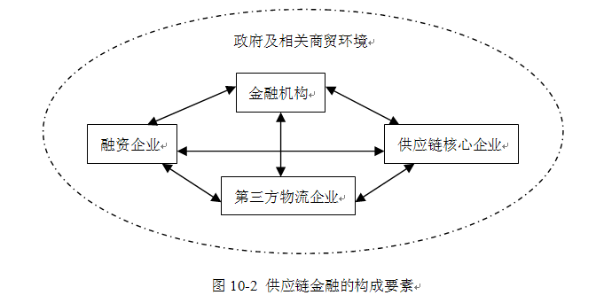 供应链金融的参与主体是整个供应链和外部金融机构,也包括专业的物流服务提供商,甚至涉及投资者。其作用范围是整个供应链的交易与往来,是一个长期持续的协作过程,金融机构和核心企业在其中起着主导性作用,第三方物流企业在其中扮演着中间人和代理商的角色。供应链金融的构成要素及相互间的关系如图10-2所示。
