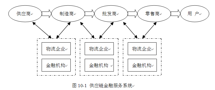 供应链金融从整个供应链的每一个环节出发,银行等专门的金融机构利用各种金融工具,引进第三方物流企业参与监管,把物流、商流、资金流、信息流链条进行有效的衔接与整合,组织和调节供应链运作过程中货币资金流动与实物商品流通趋向同步的运动,从而提高资金运行效率的一系列经营活动,并加速与之对应的商品流通速度,加速整个社会供应链的循环运转。供应链金融服务系统如图10-1所示。