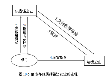 静态存货质押融资是指供应链企业将存货质押给银行时,将存货送交银行指定的第三方物流企业进行监管,在第三方物流企业对仓库实施监管后,供应链企业不得以货易货,必须通过归还融资款进行赎货。静态存货质押融资的业务流程如图10-5所示。