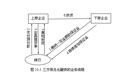 三方保兑仓的核心要点在于下游企业的销售能力和上游企业的保兑能力,三方保兑仓特别适用于下游企业在销售淡季向上游企业支付预付款,以此锁定优惠价格的情形,也特别适用于下游企业一次性付款以获取较大折扣的情形。其业务流程如图10-3所示。