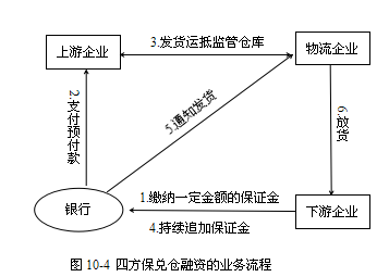 在实践中,当下游企业销售的产品为热销品时,往往会出行缺货和断供的情况,此时通过四方保兑仓融提前预订,将有助于热销品的持续供应。四方保兑仓融资的业务流程如图10-4所示。