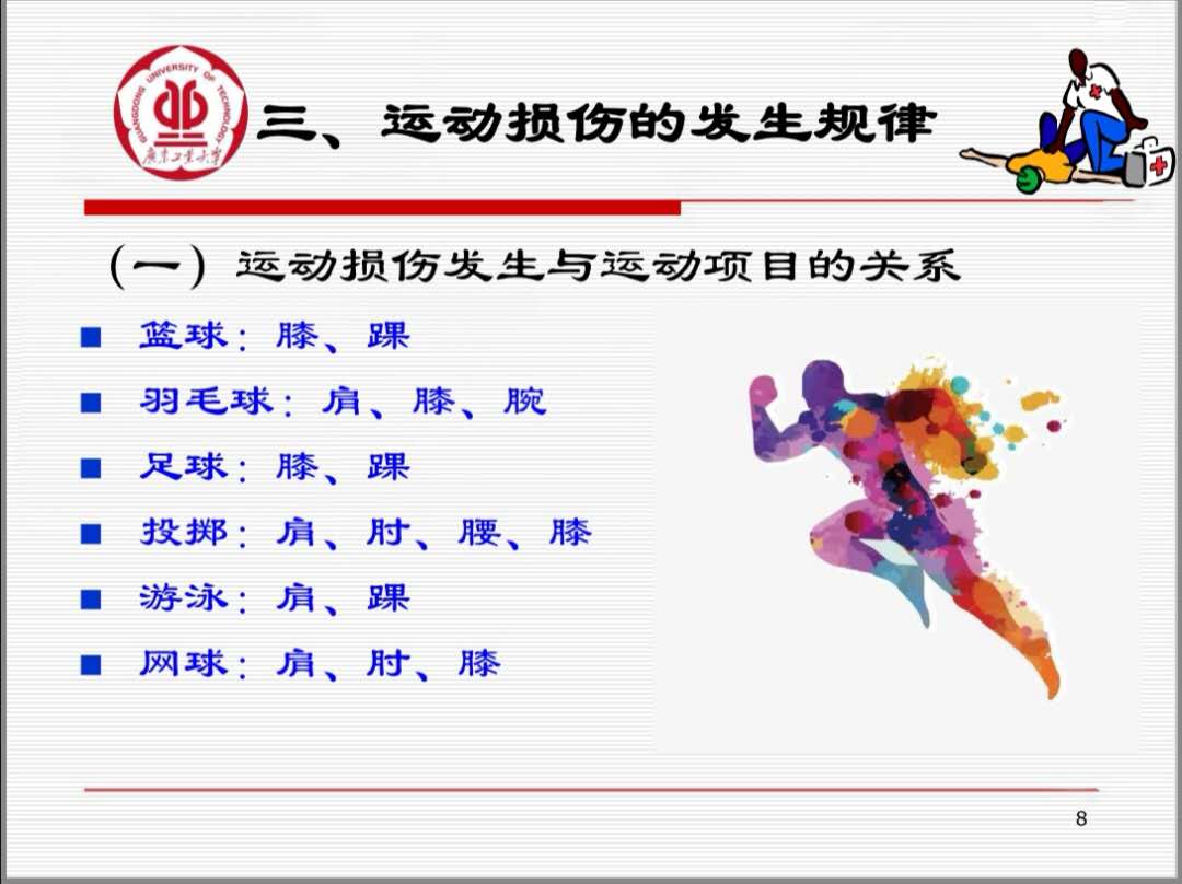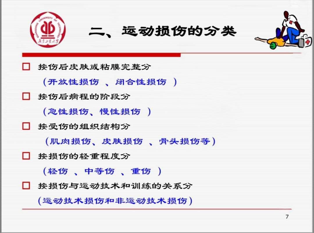 一、定义:是指在体育运动过程中所发生的各种损伤。