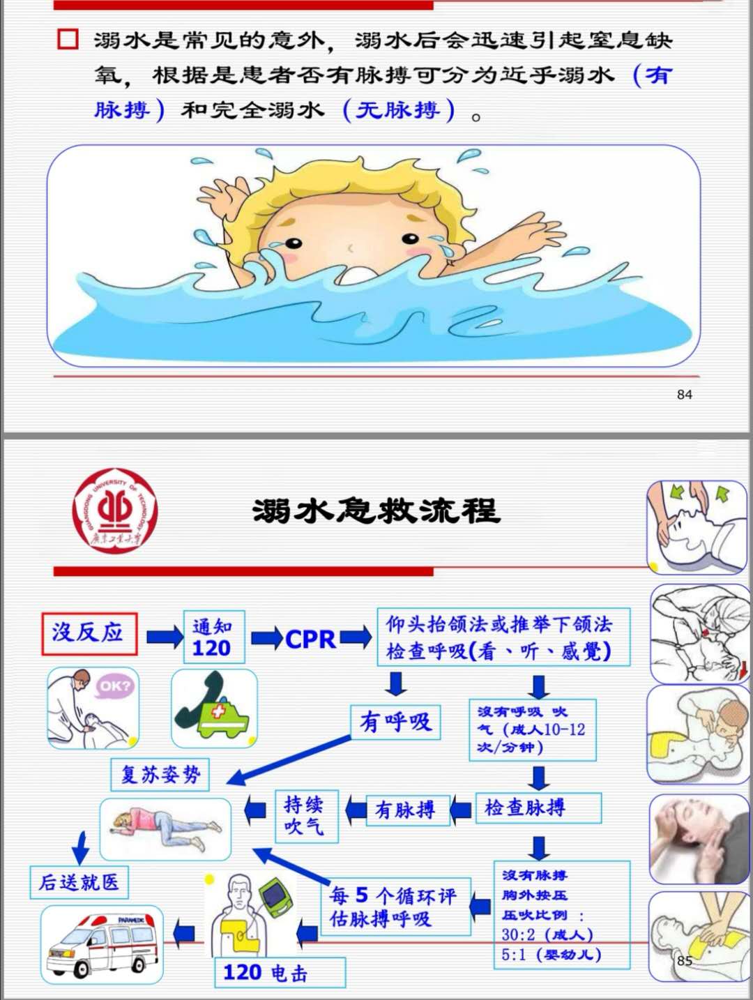 掌握了心肺复苏技术,如果我们遇到溺水、中暑、昏厥、休克就可以按照上面的方法灵活处理。记得如果有意识有呼吸要降其调整为恢复体位(侧身位)避免呕吐窒息。