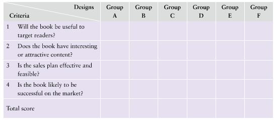 When all groups finish presentation, voteto choose the best design of the class. You will evaluate each group's design by using the following table.The score range on each criterion is 0-5 points.The higher score a design gets, the better it meets the criteria.