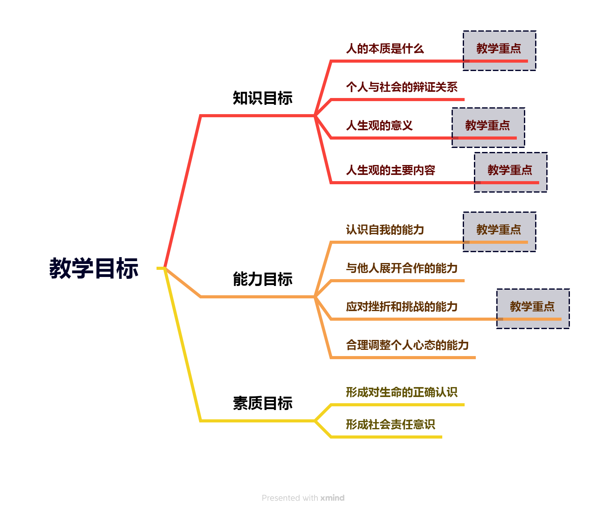 3、人生目的、人生态度、人生价值:(1)三者的定义——人生目的是指生活在一定历史条件下的人在人生实践中关于自身行为的;人生态度是指人们通过生活实践形成的对人生问题的一种稳定的心理倾向和精神状态高尚的人生追求的意义;人生价值是指人的生命及其实践活动对于社会和个人所具有的作用和意义。(2)高尚的人生追求的意义;(3)积极进取的人生态度的组成部分;(4)人生价值“三个相统一”的含义和内在联系。