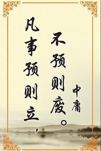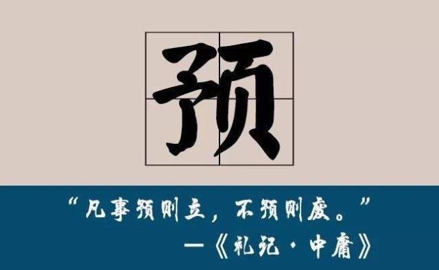 就如《礼记·中庸》中的句子:“凡事豫则立,不豫则废”。意思是:做任何事情,事前有准备就可以成功,没有准备就会失败。说话先有准备,就不会词穷理屈站不住脚;行事前计划先有定夺,就不会发生错误或后悔的事。哲学上反映的是原因和结果的关系。