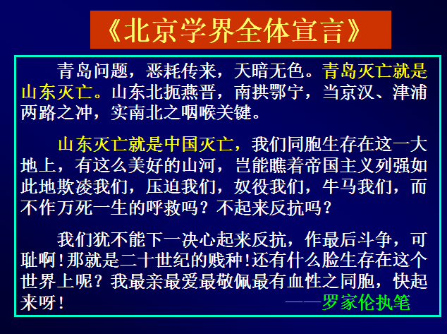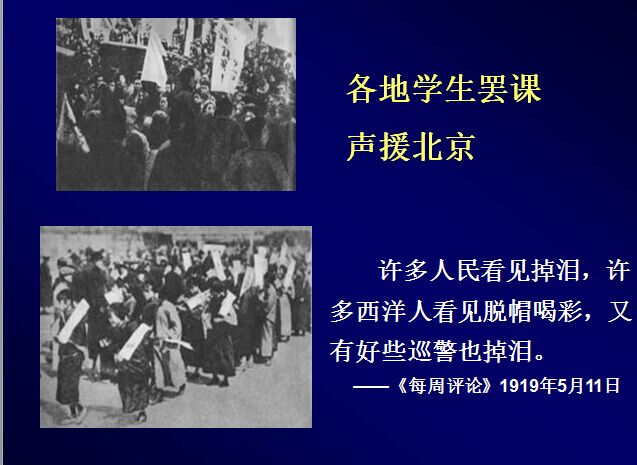 二、五四运动的爆发 1、五四运动爆发的原因 2、五四运动的过程 五四运动分为以下两个阶段: (1)5月4日到6月5日,以学生为主。5月4日,北京13所大专院校3000名学生,在天安门游行示威,高呼“外争国权,内惩国贼,”“拒绝在和约上签字”,强烈要求惩办曹汝霖,陆宗舆,章宗祥三个亲日派卖国贼,示威群众不顾反动军警的阻挠,愤怒冲进曹汝霖住宅,“痛打章宗祥,火烧赵家楼”。 (2)6月5日,以无产阶级为主。 北洋军阀政府在北京逮捕学生的行为,进一步激起了全国人民的义愤,6月5日,上海工人举行政治罢工,支援学生的反帝爱国运动,形成了以工人阶级为主的全国氛围的群众性的反帝反封建的革命运动。