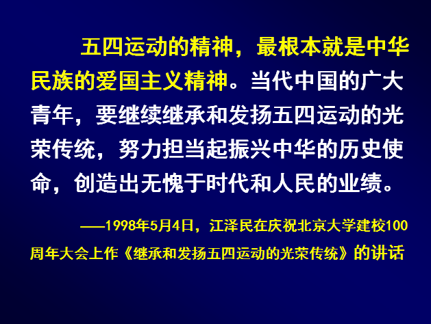 3、五四运动的历史性质和意义 五四运动是反帝反封建的爱国政治运动;新旧民主主义革命的分水岭。 五四运动发生于俄国十月社会主义革命之后,在中国虽然是反帝反封建的民主主义革命性质,但从时代和世界范围来看,已经不再属于世界资产阶级革命范畴,而是属于世界无产阶级革命的一部分。因此它开辟了中国革命历史的新纪元,是中国新民主主义革命的开端。 毛泽东在《新民主主义论》中指出:“五四运动杰出的历史意义,在于它带着为辛亥革命还不曾有的姿态,这就是彻底地不妥协地反帝国主义和彻底地不妥协地反封建主义。”是一次真正的群众运动。显示了工人阶级的伟大力量,使知识分子的眼光发生了转移,“五四运动”后一部分知识分子,脱下学生装,穿上粗布衣,开始到工人中去进行宣传和组织工作。先进知识分子与工人群众的结合,为中国共产党的成立作了思想和干部上的准备。 4、五四精神 为了使青年继承的发扬五四运动的光荣传统,1939年,陕甘宁边区西北青年救国联合会规定5月4日为中国青年节。1949年12月23日,中国人民政府政务院正式规定:5月4日为中国青年节。 “爱国、进步、民主、科学”,这就是五四精神。