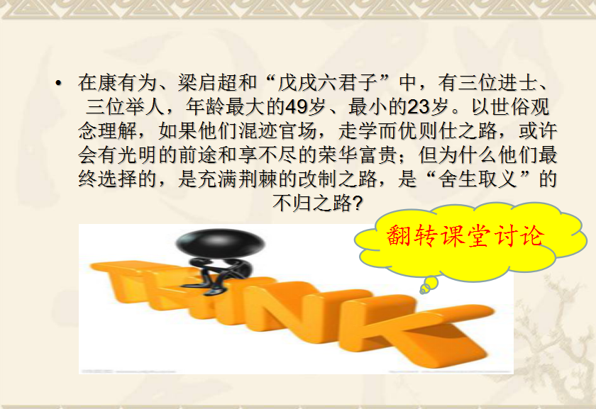 一批新式知识分子,在内忧外患的冲击和中西文化的碰撞过程中,逐步形成了一个共同认识,要救国,只有维新,要维新,只有学外国。甲午战后,他们作为中国民族资产阶级新的政治力量的代表,开始登上政治舞台。1898 年的戊戌变法,就是中国资产阶级第一次政治演出。