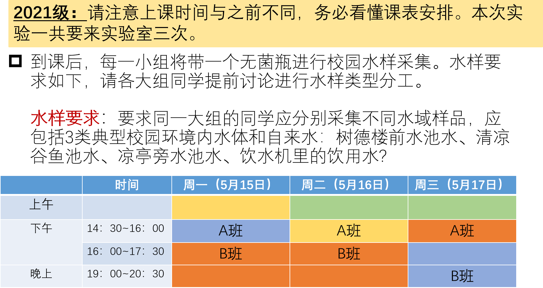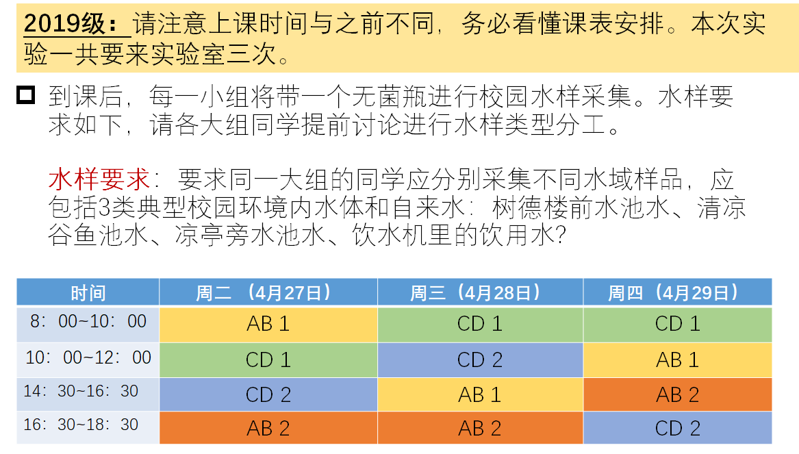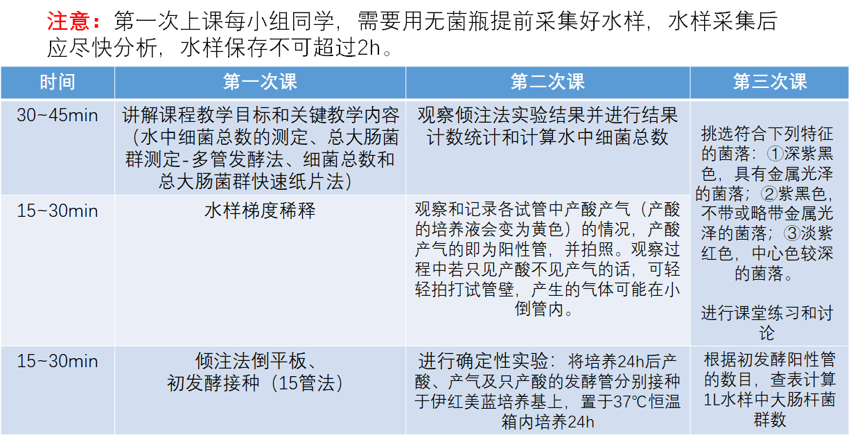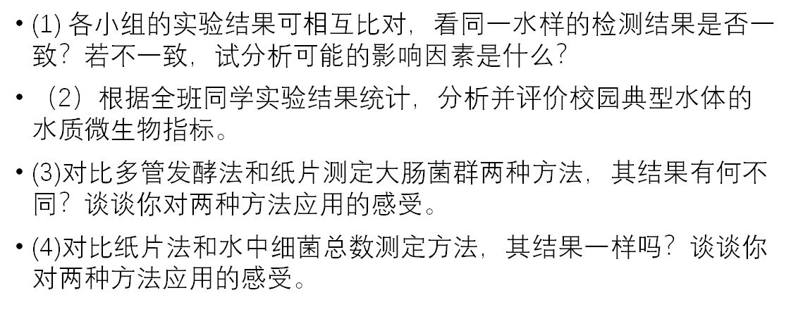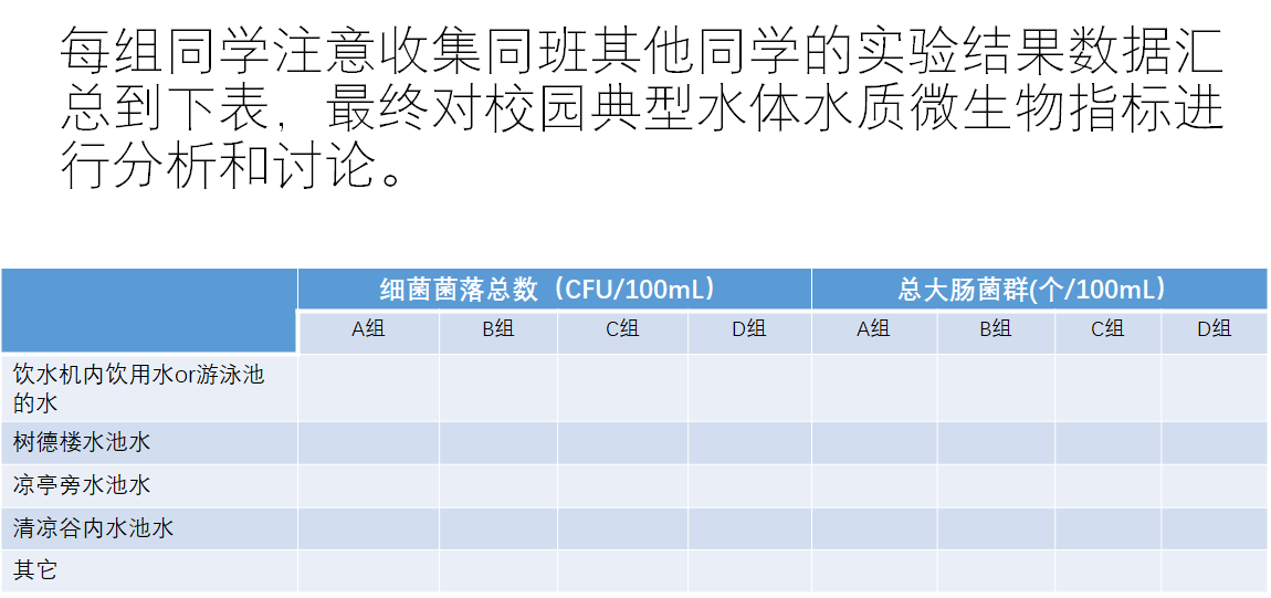 因教学设计调整,2022级实验九的内容调整为“校园水体中细菌菌落总数的测定”,不再进行大肠菌群的测定,请大家在预习时,根据实验报告模板,对实验指导视频进行选择性学习。