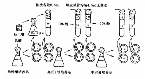 (2) 稀释:用无菌移液管吸10-2的土壤悬液0.5 mL.放入4.5 mL无菌水中即为10-3稀释液,如此重复,可依次制成10-3-10-8的稀释液(图2-1)。注意:操作时管尖不能接触液面,每一个稀释度换用1支移液管,每次吸入土液后,要将移液管插入液面,吹吸3次,每次吸上的液面要高于一次,以减少稀释中的误差。